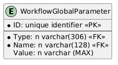 DB entitiesTablesWorkflowGlobalParameterOn this pageWorkflowGlobalParameter Entity Reference SchemaNameTypedboWorkflowGlobalParameterTable Columns NameKeyData TypeReferenceID+Unique identifierTypenvarchar(306Namenvarchar(128)Valuenvarchar(MAX) Unique keys Key nameColumnsPK_WorkflowGlobalParameterIDIX_Type_Name_ClusteredType, Name